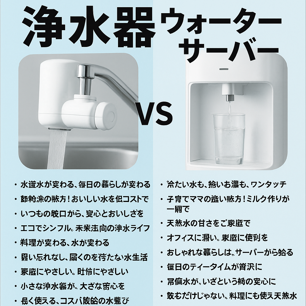 しかし、どちらが自分のライフスタイルに合っているのか悩む人も少なくありません。この記事では「浄水器」と「ウォーターサーバー」を徹底比較し、コスト・利便性・衛生面・味の違いを詳しく解説します。最後にはターゲット別おすすめも紹介しますので、導入を検討している方はぜひ参考にしてください。